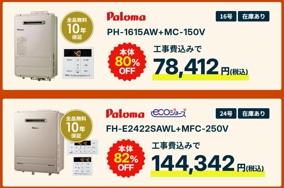 する事で従来型のガス給湯器が最大80%OFF!また省エネ型の人気のエコジョーズも最大82%OFFとなっています。